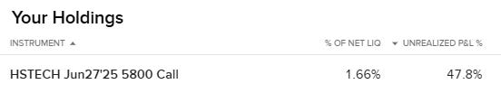 HSTECH call - doing very well. HSTECH ended the day at 6,068.77 HKD. So I’m very much ITM for this one.